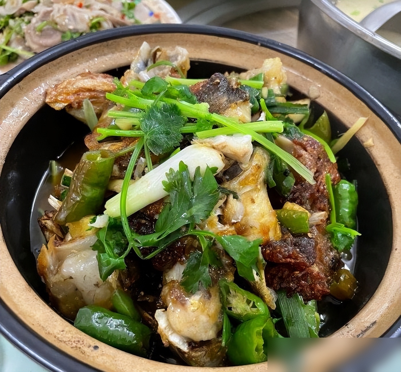 在韶关,砂锅鱼头可是当地人餐桌上不可或缺的美食。老板娘精心挑选当地新鲜的鱼头进行烹饪。鱼头先经过腌制入味,再裹上一层薄薄的淀粉放入油中炸至金黄。如此一来,外皮香脆,肉质鲜嫩多汁。在焖制的过程中,油盐酱醋等调味品的香味四溢开来,酒香味浓郁,让人光是看着就忍不住想要咬上一口。