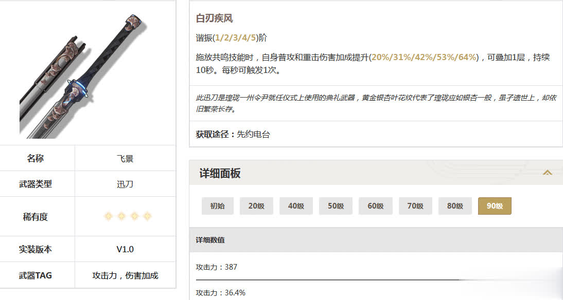 四星武器中倒是有普攻伤害加成,大月卡的飞景比较合适,普攻和重击伤害加成叠满64%,当然,四星武器的问题就是没有暴击爆伤,刷声骸很难受的嘞。