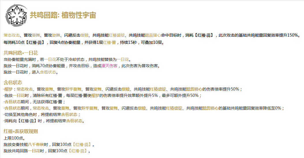 椿的伤害比较奇怪,白椿伤害在普攻里,红椿伤害在共鸣技能里面但整体伤害普攻占80%,所以椿的普攻和共鸣技能优先级最高。而椿爆发伤害最高的一日花,又来自共鸣回路,所以逮住这三个点就可以了