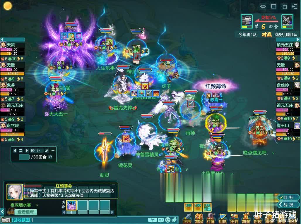 不难看出,这两个门派都有法术免疫能力的特点。五庄的日月同辉、盘丝的镜花缘都能帮助免疫魔法伤害,这对限制对手镜花灵的发挥有很大影响。而且镜花灵必秒残血,完全可以预判对手会被法术攻击的单位,借助镜花缘的魔法反震效果反弹大量伤害。