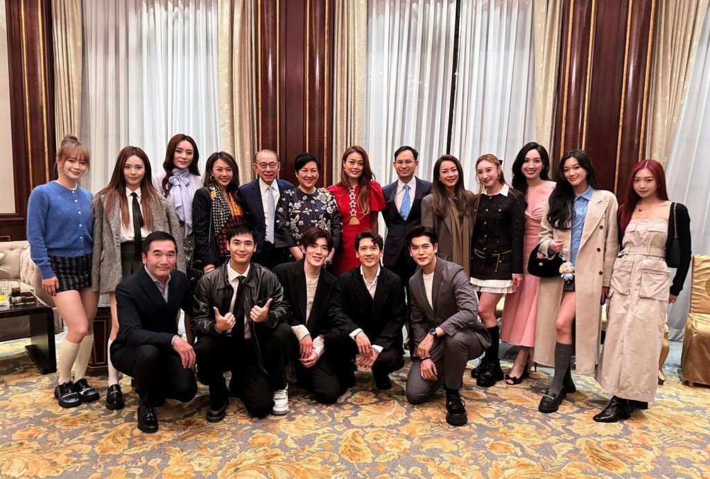 旁边绕着杨生的就是容祖儿、蔡卓妍(阿Sa),还有古巨基夫妇、霍汶希、陈家乐、方中信、欧阳震华、温碧霞、周励淇等等,站满四排人,场面热闹,阵容强劲,相当壮观。