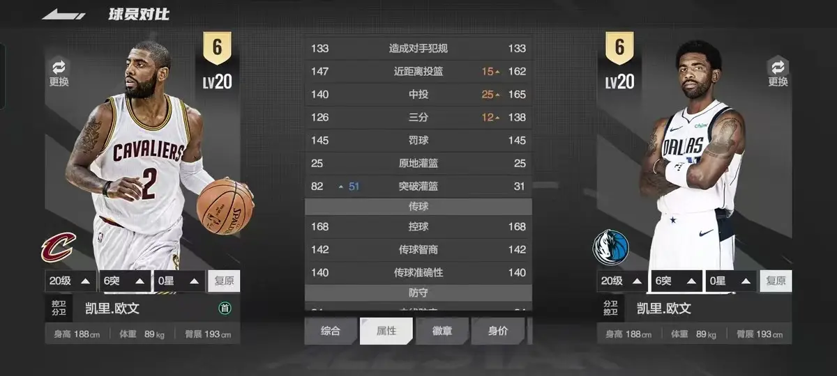 在能力值设定上有个有趣的现象:现役欧文虽然整体略胜一筹——无论是中投还是三分等投射能力都更精准,但骑士版欧文的突破灌篮数值却比现役版高出51点。这种成长轨迹恰似其偶像科比的技术转变:年轻时敢打敢拼,飞天遁地令人惊叹;随着生涯推进逐渐转型,用更稳健的中远投主宰比赛。