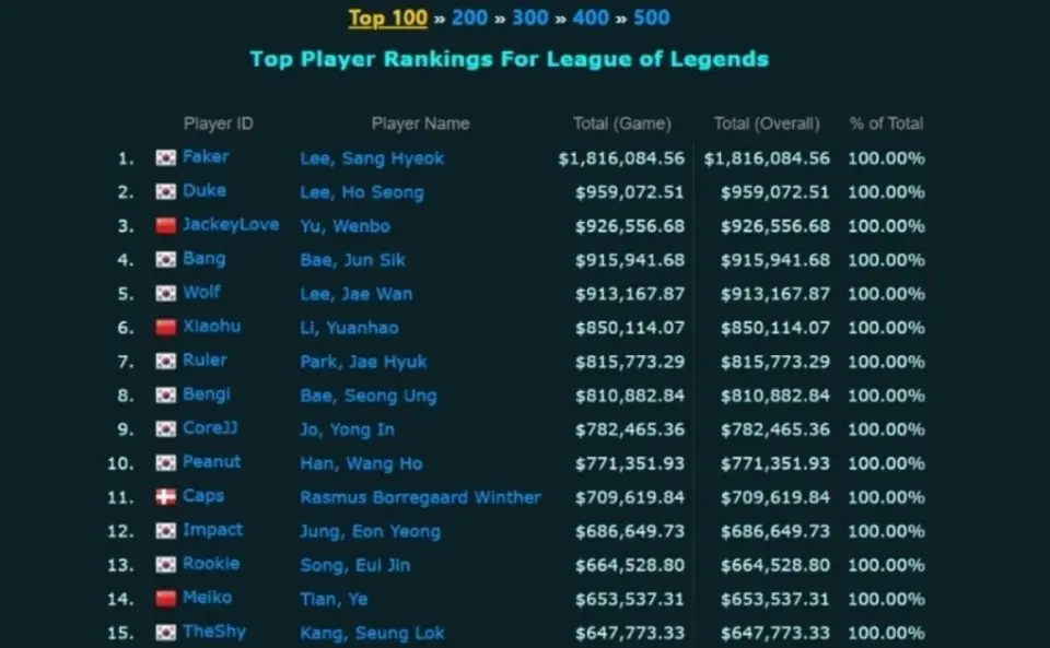 而排名第二的则是Duke,他曾经在SKT夺得了S6冠军,之后来到LPL加入IG,并在S8期间夺得冠军,也是手握两个S冠的人,去年短暂回归当了一段时间教练,之后就没有声音了!值得一提的是昔日跟随SKT一起夺冠的几名选手,Bang、Wolf、Bengi打野和下路三人组,他们也都排在了前十,分别是第四和第五以及第八位!而刚刚夺得全球先锋赛冠军的Peanut,他的奖金池也升到了77万,冲进了前十,作为一个大龄老选手,他已经从年轻的花生变老花生了,但依旧还能够在赛场上打出很好的表现,而且是越打越好的那种!值得一提的是,这份榜单中,Jackeylove冲进了前三,这也是LPL选手中排名最靠前的!