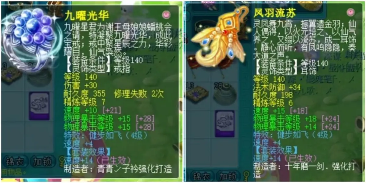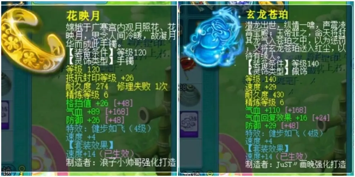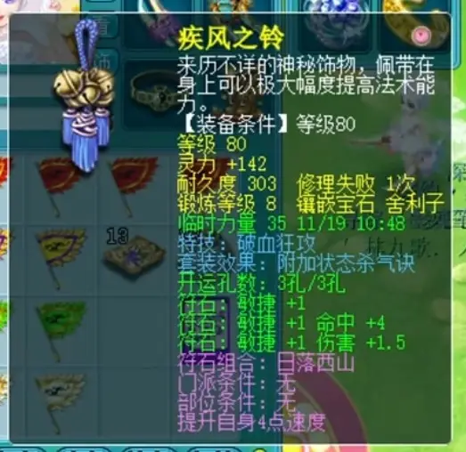 后排手镯为120级,佩饰为140级,综合属性为2气血2防御1格挡。钟灵石套装选择了4级健步,给角色提供了不少的速度属性。