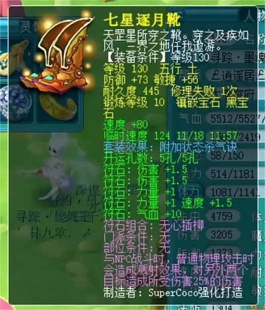 鞋子为130级的杀气诀套,镶嵌了10锻黑宝石。