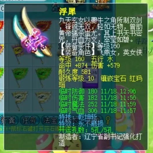 武器为160级不磨双短剑,镶嵌了10锻红玛瑙,总伤达到870点,附带特技乾坤斩。