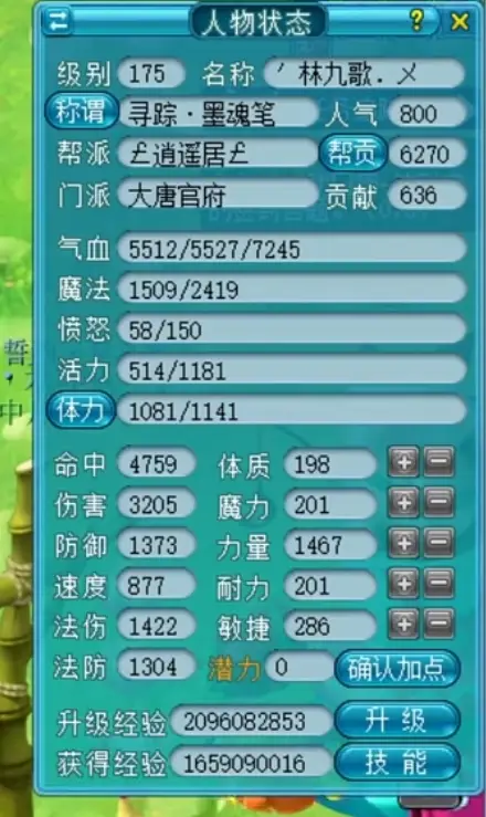 在不携带神器,并打满临时符的情况下,这个大唐官府拥有7245点气血,3205点伤害,1373点防御,以及877点速度。这样的175任务大唐,小伙伴们喜欢吗?