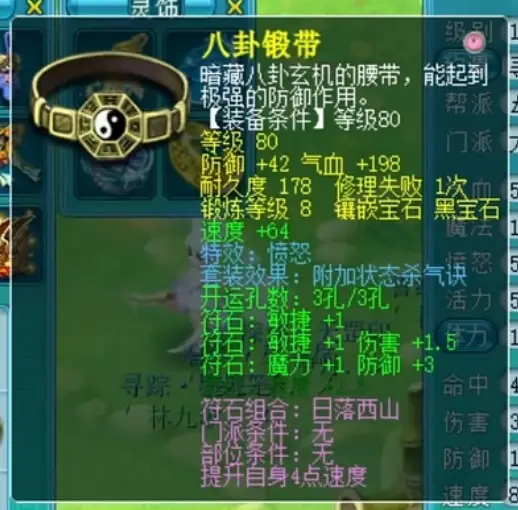 腰带为80级的杀气诀套,镶嵌了8锻黑宝石,附带愤怒特效。