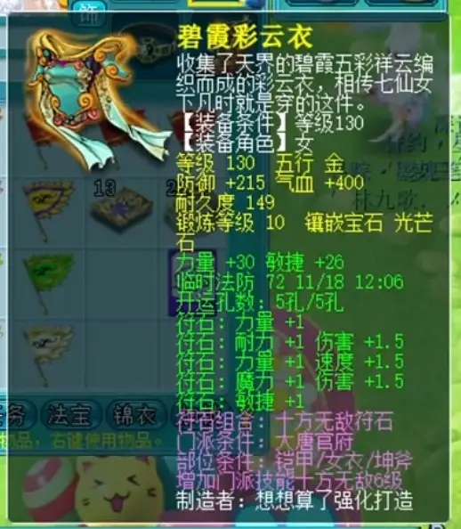 女衣为130级,力敏双加56点,镶嵌了10锻光芒石。