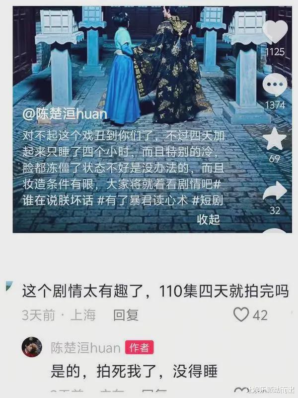 该剧4天拍完119集,男主演员都在抖音评论里直呼“拍死我了,没得睡。”剧里剧外都是“牛马打工人”的写照。