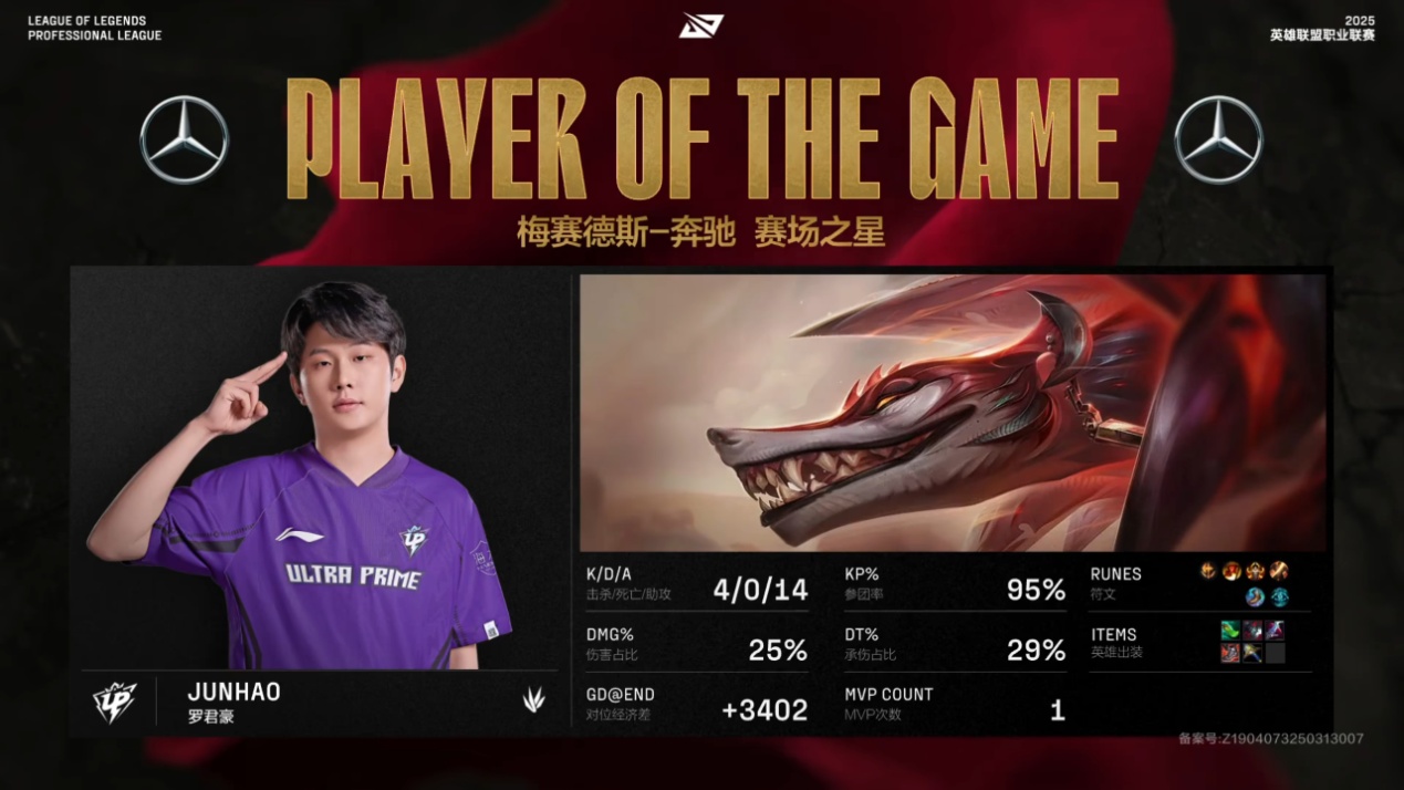 在成功击败RNG之后,UP在面对TT的比赛中也是成功获胜,Junhao再次立下大功,选出一手盲僧连续进攻打出优势,帮助队伍拿下了2胜1负的好成绩。