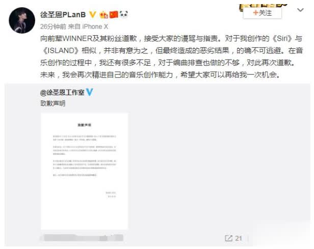 不过值得注意的是,徐圣恩工作室那处理速度,杠杠的。在同日下午就迅速作出回应,发布了一份诚挚的道歉声明。又是表示对此事感到十分震惊,又是决定立即将《Siri》从全网音乐平台上下架,同时暂停所有与该单曲相关的宣传活动,还向所有相关合作单位以及WINNER组合表达了深切的歉意。