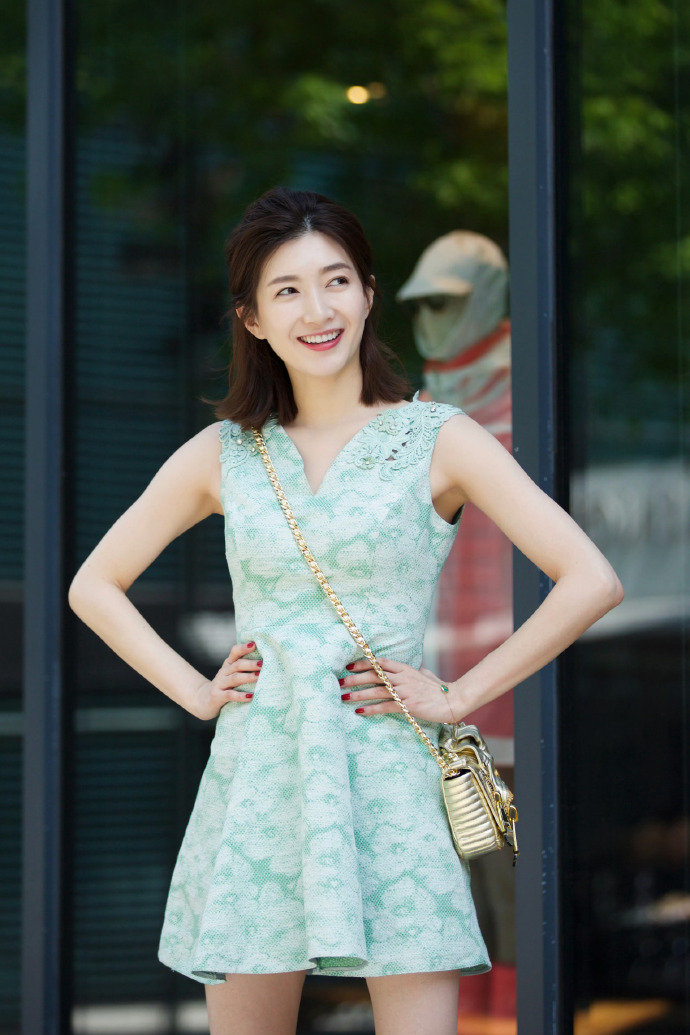 双手叉腰,正面展示绿裙的细节。蕾丝领口的精致花纹,每一针每一线都彰显着工艺的精湛,与裙子上的花纹相互呼应,形成了和谐的美感。金色链条斜挎在身上,链条的长度恰到好处,既不会过长显得拖沓,也不会过短显得局促。再加上那一抹红色的指甲,与浅绿色的裙子形成了鲜明的色彩碰撞,如同点睛之笔,为整体造型增添了几分热情与活力。江疏影的眼神坚定而自信,直视镜头,仿佛在告诉世界,时尚就是她的主场,她就是时尚的主宰者,这种强大的气场让人不得不为之赞叹。