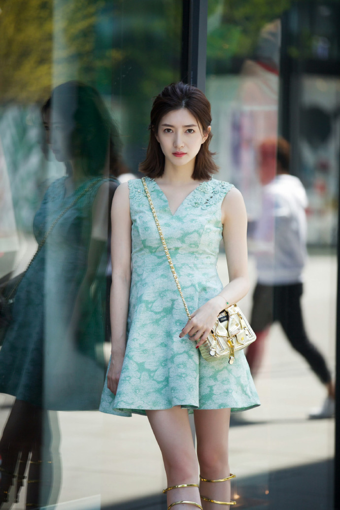 站在玻璃旁,背景中有人流经过,但江疏影却成为了街头的焦点。浅绿色的连衣裙在街头的阳光下闪耀着独特的光芒,面料的光泽度与周围的环境形成了对比,使得她更加突出。金色的高跟鞋在地面上投下小小的影子,仿佛是时尚的印记。她的姿态优雅,眼神中透露出一种从容与淡定,即使在人流穿梭的街头,也能保持自己的时尚态度。这张照片展现了她独特的街头魅力,仿佛在喧嚣的城市中开辟出了一片属于自己的时尚天地,让人忍不住驻足欣赏。