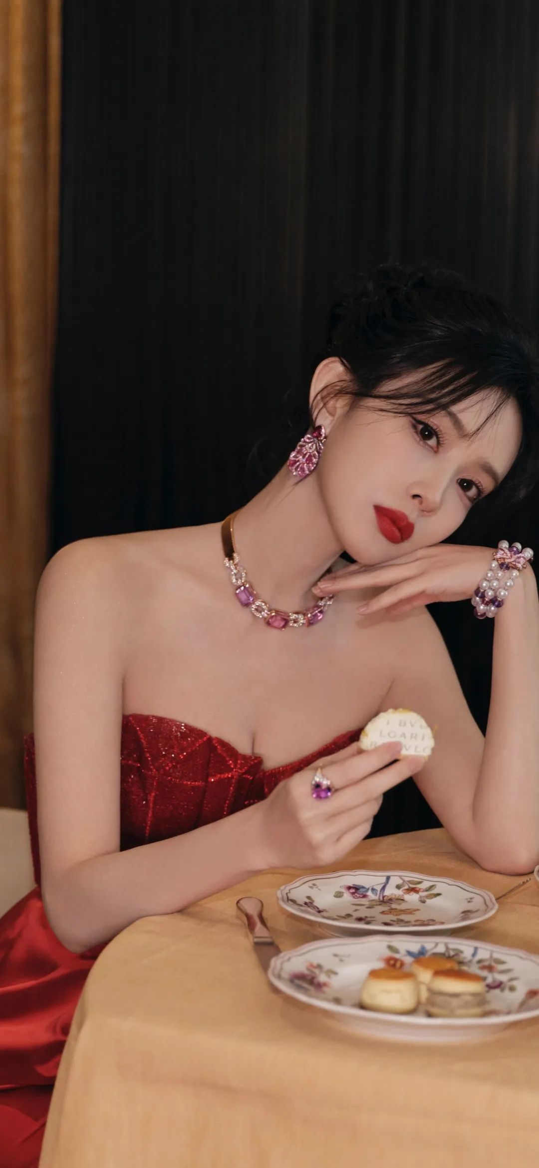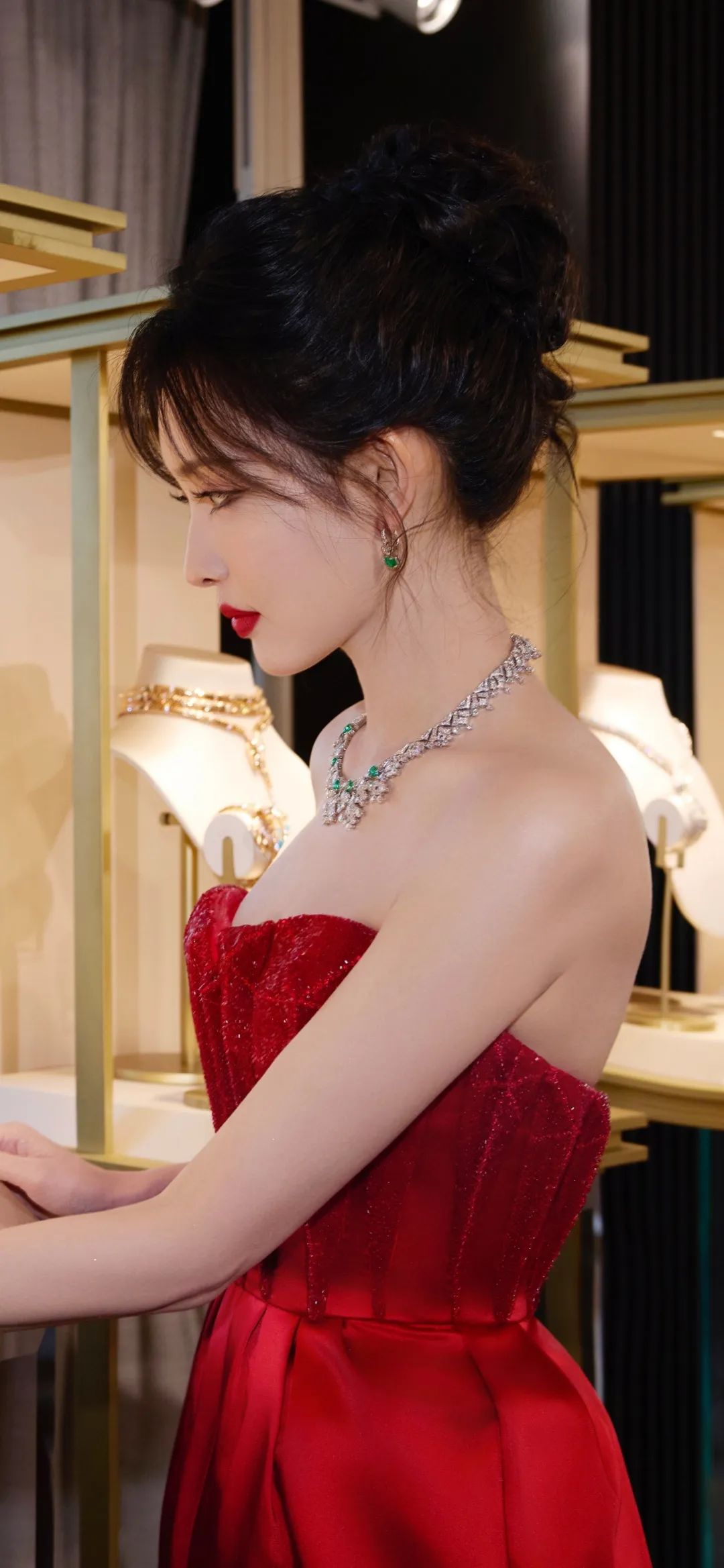 红色抹胸裙的剪裁极为精妙,紧紧贴合身体曲线,将她的身材优势展现得淋漓尽致。背景的灯光设计温暖而柔和,与珠宝的光芒相互映衬,营造出一种奢华而神秘的氛围。孟子义的时尚表现力在这张照片中发挥到极致,仿佛她就是时尚的代名词。