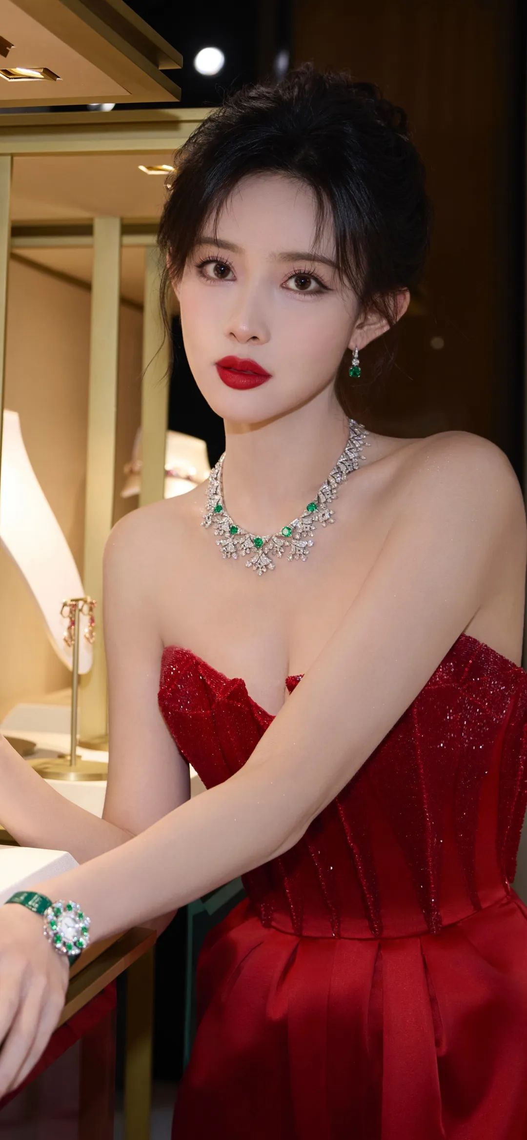 孟子义身穿红色抹胸裙,佩戴着精致的钻石与绿宝石项链,耳饰与之相呼应。这条项链采用了精湛的钻石切割工艺,每一颗钻石都闪耀着璀璨光芒,绿宝石色泽浓郁而纯正,与红色裙子形成鲜明对比,更显高贵典雅。她的发型整齐,妆容精致,红色口红与裙子相得益彰,背景的珠宝展示柜更突显了她的时尚感,仿佛在诉说着珠宝与美人之间的完美契合。