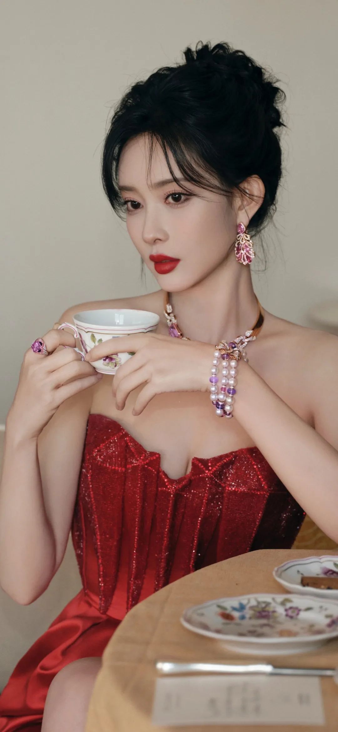 孟子义手持精致茶杯,杯身上的花纹细腻而精美,仿佛在诉说着一段优雅的下午茶时光。她佩戴着不同风格的珠宝,粉色系的珠宝可能是粉钻与珍珠的巧妙搭配,与红色裙子形成对比,增添了几分柔媚。这样的搭配不仅展现了她的时尚品味,更透露出一种精致的生活态度。