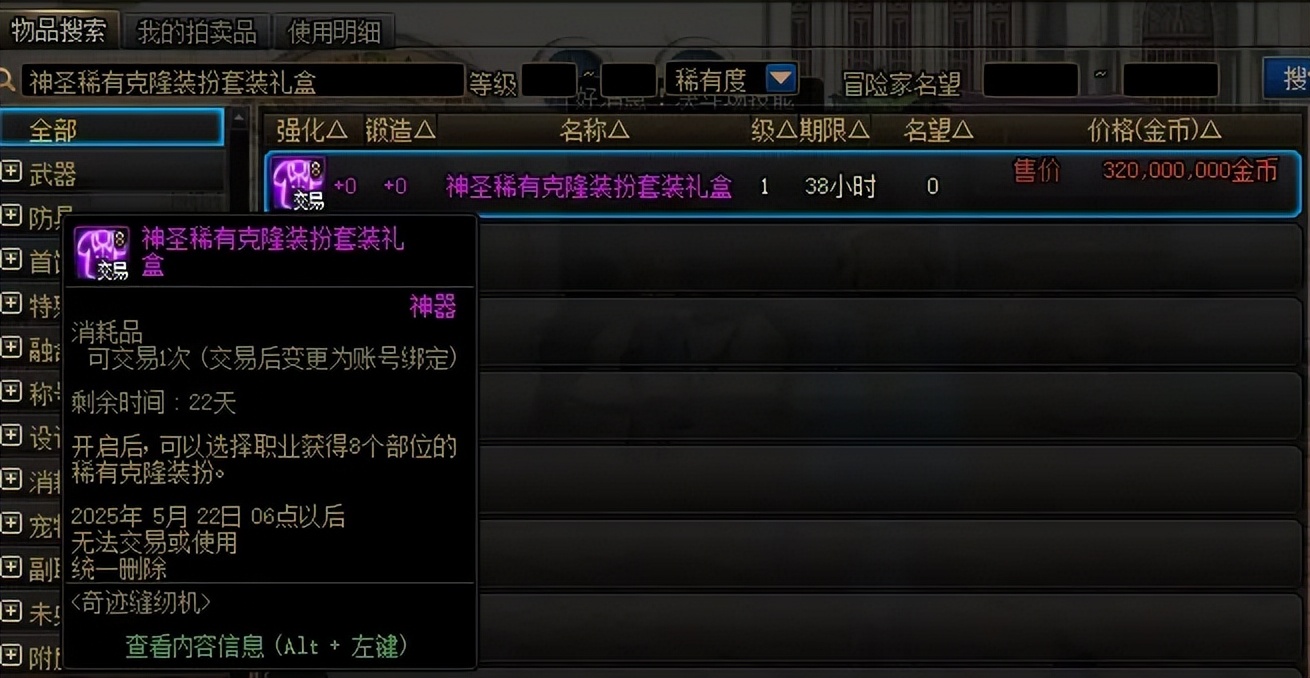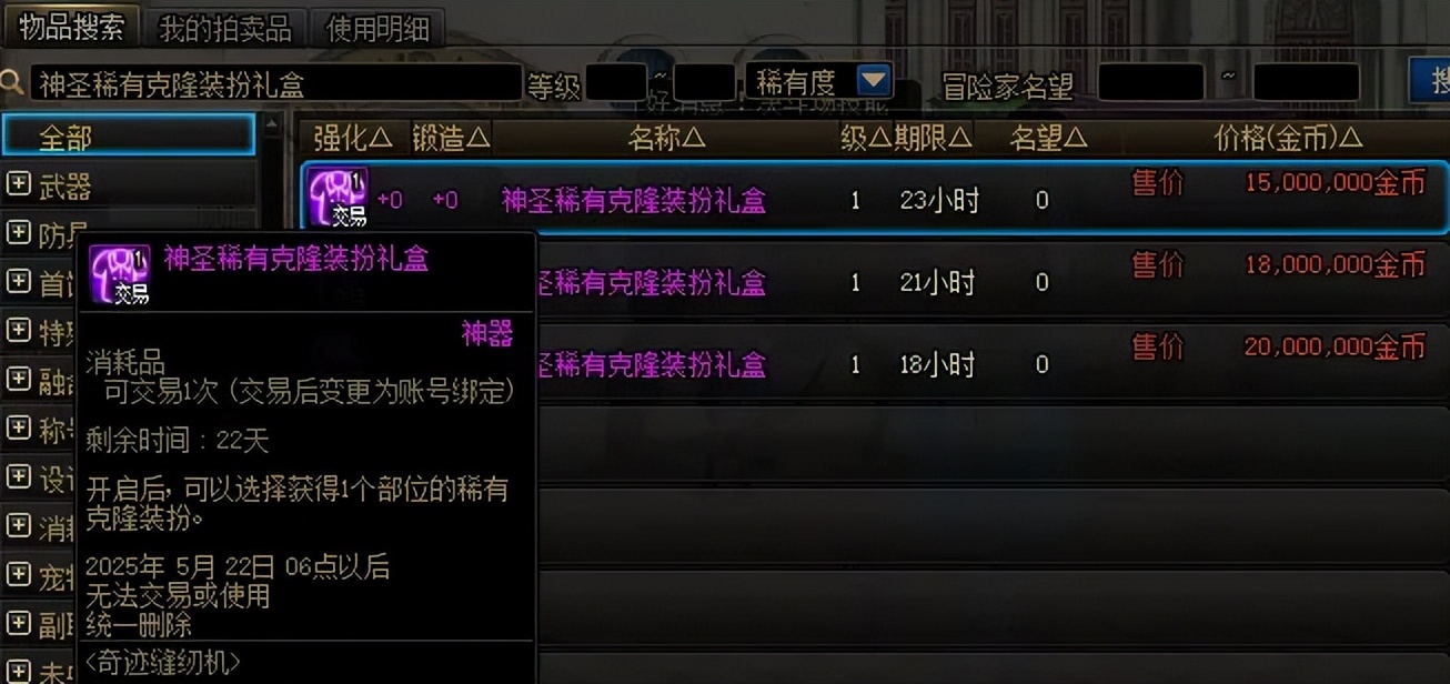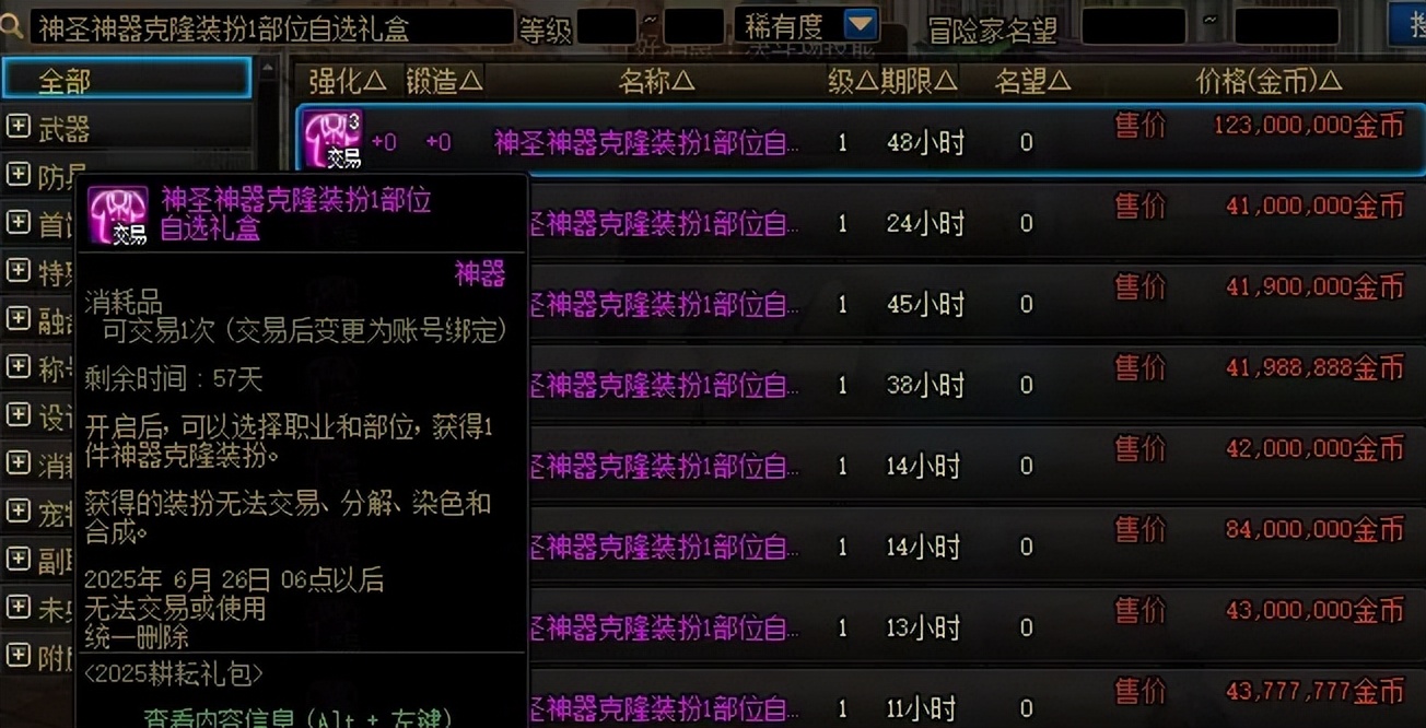 答案也是有的,需要在拍卖行搜索“神圣神器克隆装扮1部位”,目前售价在4100万左右。