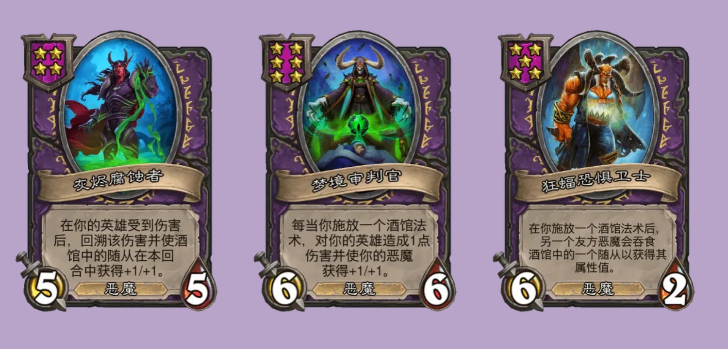 法术恶魔的倒转流派主要玩法还是和上个版本差不多,但是核心随从都产生了变化,灰烬腐蚀者相当于牺牲经济能力融合了阿克蒙德和老大哥,梦境审判官则是变成了自伤发动机,因为恶魔不能像元素那样养buff,所以这个+1/+1有的时候更偏添头,主要成长方式依然是红腹口狂蝠恐惧卫士来吃酒馆随从,虽然说随从体系里没有了经济能力,但是这个版本有饰品,可以靠饰品来获得法术,理财法术拿到的够多的话,一回合也是能打出巨量法术的。但不得不说这个版本酒馆战棋比之前更卡了,尤其是手机端,经常卡到一堆法术没打出去。