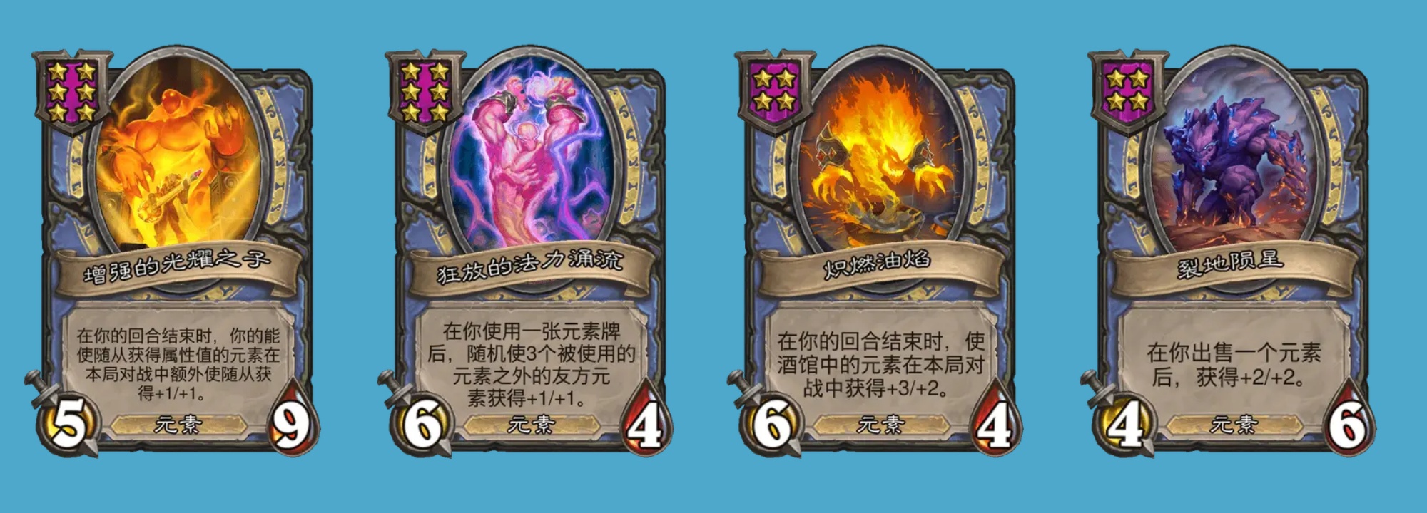 新版本元素种族和这次主推的“能使”法术流派一样,主要靠养大元素的buff能力,既可以养炽燃油焰buff酒馆的能力,也可以狂放的法力涌流buff场上的元素,四本的裂地陨星也是一个很重要的成长点,因为卖出元素给他带来的buff也可以被养大。新版的元素有点像当年野猪人的玩法,养“buff效果”就有点像在养“鲜血宝石”,而且元素buff的频率感觉是要比当年野猪人贴鲜血宝石的频率高很多的,因此现在元素整体热度和强度都是挺高的。