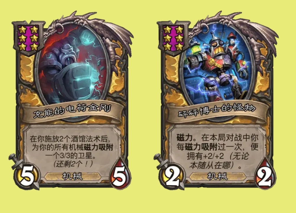而和恶魔和元素一样上限很高的还有机械种族,核心是充能的电荷金刚,通过释放酒馆法术来给全体贴磁力卫星,这个卫星是之前月铁同款,虽然不能变大,但是能够提供大量的磁力吸附次数,因此可以把砰砰博士的怪物养得很大,所以如果能每个随从贴上一两个砰砰博士的怪物,光靠电荷金刚贴卫星就能涨很大了,同样能和恶魔元素一样身材破千,而且机械相对来说更容易满场圣盾,身材质量会更好一些。