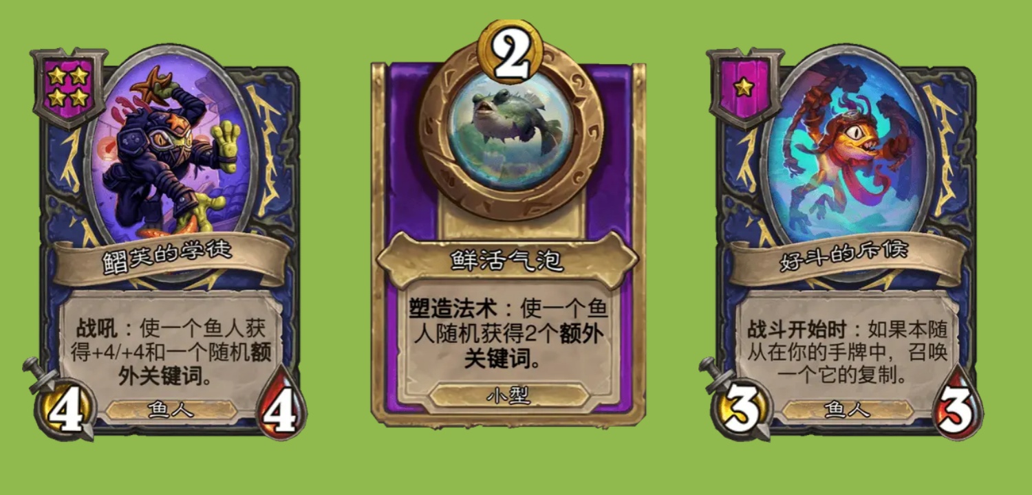 鱼人种族的新随从鳛芙的学徒刚上线没到早上就被移除了,不愧是小巨壳龙,不仅可以场上整一堆复生烈毒,甚至还可以靠给酒馆里的鱼人贴额外关键词,然后再藏一两个烈毒复生在手里,可惜清风还没玩过就没了,只能通过鲜活气泡来简单体验一下了,这个塑造法术给的关键词是可以保留的(可惜也被今天的热修补丁移除了)。另外鱼人种族的一本随从好斗的斥候也是挺厉害的随从,因为他开局跳出来的是复制,所以本体还能够被低音提琴鱼人拉出来,不过感觉现在的鱼人单靠刷身材不占优势,而且手牌鱼大身材的只有那一两个,遇到恶魔元素还是得下毒。