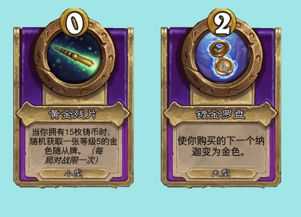 另一个印象比较深刻的是黄金残片,这是个海盗小饰品,所以提前拿一个白赚赌徒,或者拿慎重投资,即使不拿诈骗犯提升铸币上限,稍微卖点怪也能轻松达成条件,而现在五本核心还是有不少的,清风就靠他拿了金恐惧卫士,直接吃鸡了。而最让清风觉得难受的大型饰品就是镀金罗盘系列了,拿完之后普通的随从不敢拿了,但又死活刷不到核心随从,尤其是有一把元素种族,因为镀金罗盘停滞了一回合发育,最后赶紧提前下车了,只能说感觉除非脸上正好刷了一个核心,还是降低抓取的优先级好了。