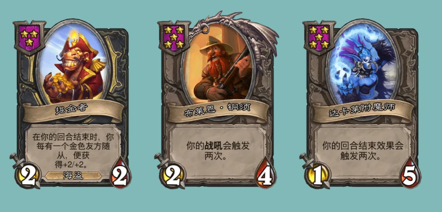 剩下的种族里,纳迦的玩法感觉没有太大的变化,基本上还是靠碎地者。海盗的全金流玩法,感觉靠掘金的成长还是太慢了,完全跟不上现在这个版本的数值水平,还是得增加经济能力,用火药运输工养狂战和空间眺望者。巨龙种族还没有来得及体验过,不过看遇到的对手很多都是靠护植绿龙触发最右边战吼给酒馆法术的随从来养,新赛季里铜须的地位非常低,因为战吼经济怪少了很多,大部分都是给buff法术的,拿到铜须后也很难获得大量的经济,很多和铜须相关的阵容也变弱了,但是达卡莱的地位被提高了很多,元素机械恶魔这个三个版本热门种族都要用到达卡莱,因此能配合达卡莱的生火专家倒是经常在其他种族阵容里看到。