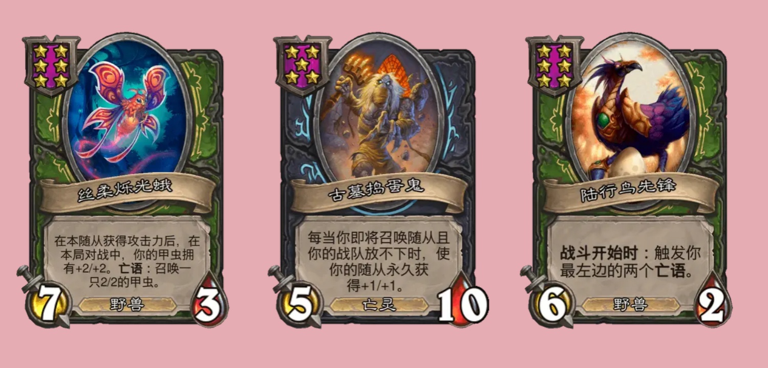 野兽的甲虫在新赛季获得了一张六本核心:丝柔烁光蛾,通过给它加攻就能养大甲虫,那么有什么办法能够高频率的给它加攻呢,大伙想到了另一个流派:挤爆流,捣蛋鬼就能够多次给蛾子加攻,而且正好可以利用到野兽的另一个六本怪:陆行鸟先锋,鸡哥总算是又能在野兽阵容里就业了,不过清风感觉得比较胡才能玩的出来,经常不是没搜到捣蛋鬼就是找不到蛾子,好不容易集齐了已经来不及养大甲虫了。