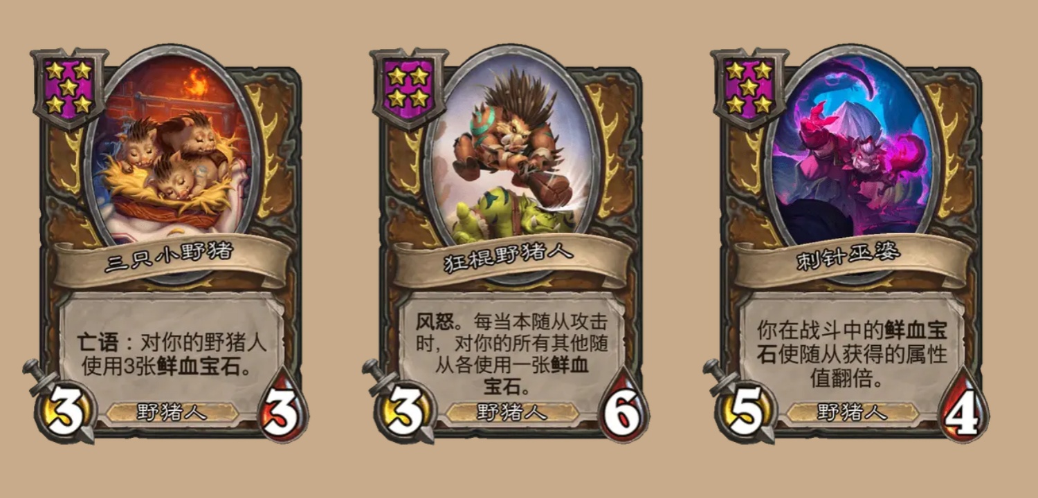 既然提到了野猪人,那就聊一下野猪人吧,新赛季野猪人的主要套路变成战斗中贴宝石了,其实到没有想象中那么弱,但明显能感觉到野猪人养鲜血宝石的能力比之前要弱不少,局外获得的鲜血宝石也少了很多,战斗中贴鲜血宝石的主要战力是靠三只小猪,其次是狂棍野猪人和作曲鬃师,而且还要配刺针巫婆,当然还可以靠饰品来贴。现在的野猪人变成了中期发力的种族,没法和元素和恶魔拼后期能力,但是一旦拿到关键随从就能一回合快速拉升战斗力,而且大部分重要核心都在四五本,但拖到后期就有些乏力了,而且在战斗中强化自己难免就会受到打团的影响。清风上面提到的那把塞纳留斯两回合成型的野猪人,打到后面已经感觉差点就打不过了,可能对面再苟一个轮次就要落败了。