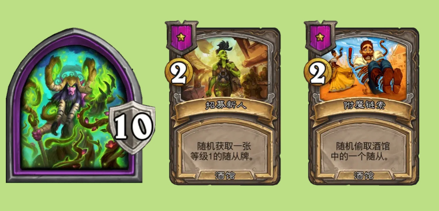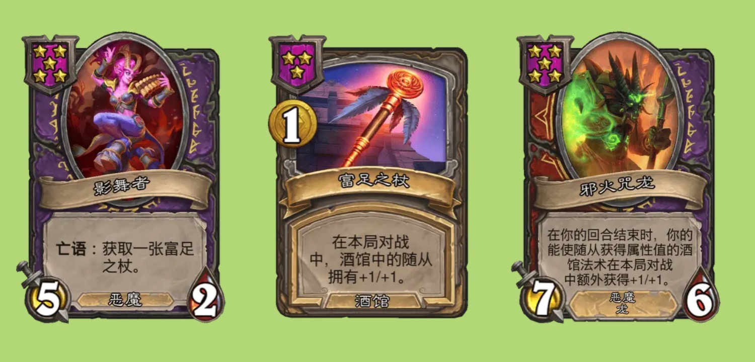 不过太卡的话还可以考虑另一种流派的法术恶魔,靠影舞者获得能buff酒馆的富足之杖,再用邪火咒龙养大富足之杖的buff效果,最后靠魔蝠和恐惧卫士吃掉酒馆随从,玩这个流派的法术恶魔最好还要有野兽种族,因为有鹦鹉以及鸡哥触发亡语可以获得更多的富足之杖,再配合瑞文,每回合可以拿到好多富足之杖,养起酒馆来效率并不比恶魔倒转差,而且还是永久buff,最主要的是不至于因为太卡了操作不过来。