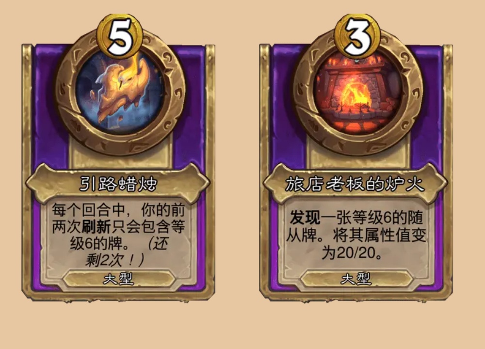 而大型饰品里面,最让人印象深刻的应该是“引路蜡烛”这个饰品,每回合有两刷的机会全是六星,能让你直接成型,尤其是现在强势种族,元素恶魔机械,甚至纳迦,挤爆甲虫等,成型阵容都需要多个六本随从,这让引路蜡烛的优先级大大提升,清风遇到一局三个对手都选到了引路蜡烛,然后他们仨选到蜡烛之后就疯狂入满别人,没两回合就留我一个走位好的进决赛圈了。而相比之下同样是大型饰品的“旅店老板的炉火”就显得幽默太多了,3枚铸币只能拿一个六本怪,设计师不会觉得20/20的身材真的很大吧……因此炉火在热修补丁里被光速下调为0费,不过引路蜡烛居然也下调了2费这是我没想到的。