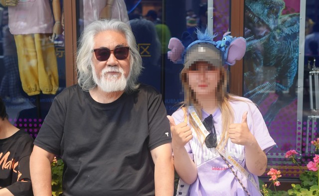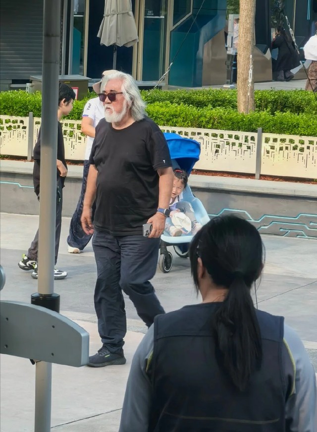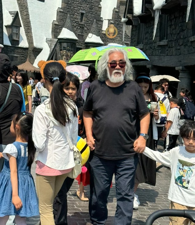 环球影城偶遇74岁张纪中,竟背着孩子游玩!