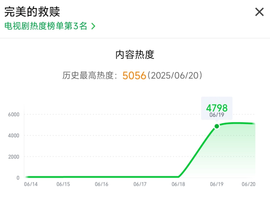 不过,没等来上述两部剧定档,反而等来了桃厂新作《完美的救赎》,开播20分钟后热度就突破4500,势头相当猛了。