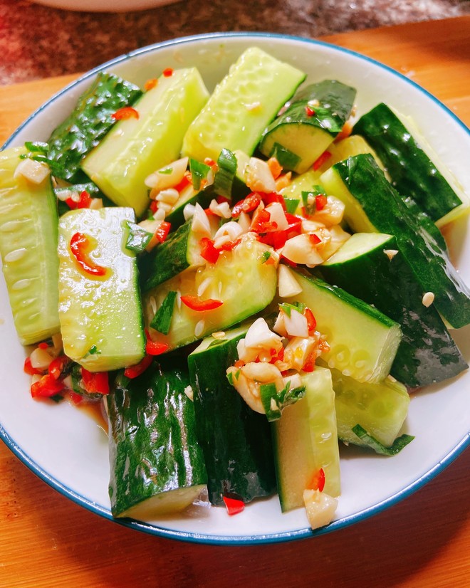 传统做法咱也熟悉,黄瓜洗净后放案板上,用菜刀横拍至裂开,再切小块,拍裂是为了更易入味。然后加盐抓腌3分钟,挤掉渗出的水保持脆感,接着加蒜末、小米椒圈、生抽、香醋、香油拌匀就行。但这里面也有小窍门哦,黄瓜冷藏后再拍更脆,用宽面菜刀拍打更易裂开入味。