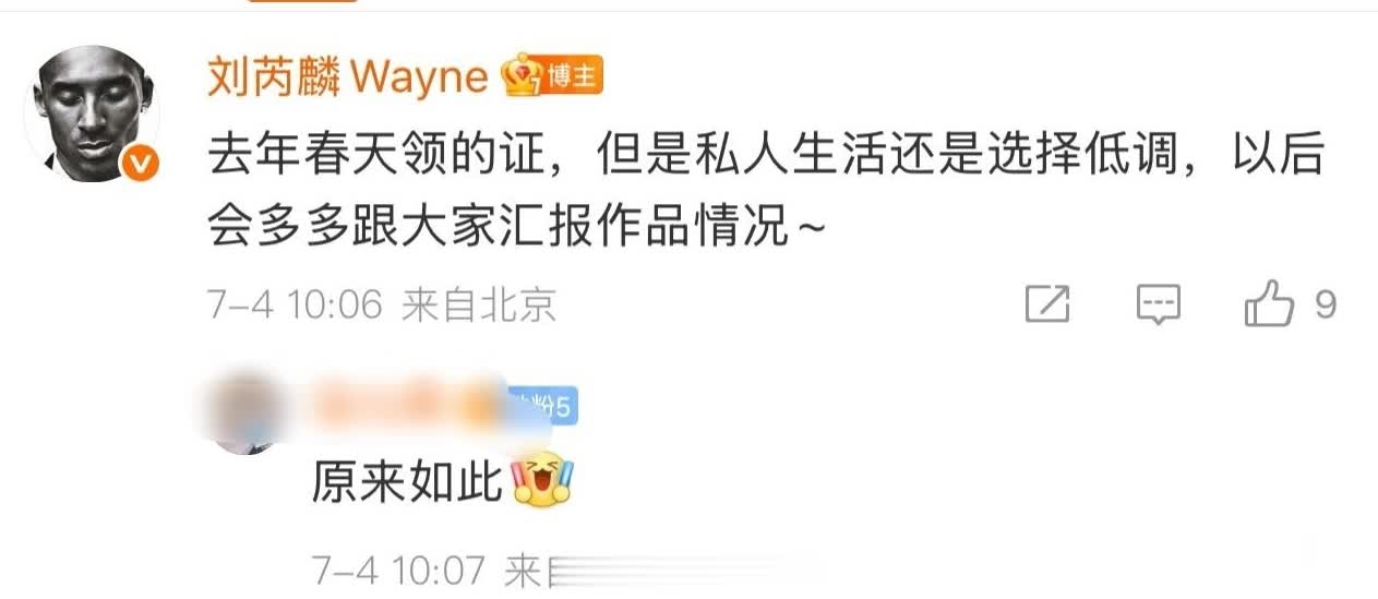 留言处,刘芮麟透露,他和女友是在去年领证结婚的,但因为私人生活还是选择低调。不过他保证,以后会多多跟大家汇报作品情况。