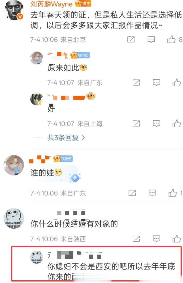 也许是基于这份恋情的短暂,亦或者长时间生活在娱乐圈导致的“惧怕”,所以这次公开直接一步到位,至于其妻子的身份,虽然他没有公开细节,不过有网友在去年年底于西安遇到了他,由此猜测,刘芮麟的妻子应该是西安的。