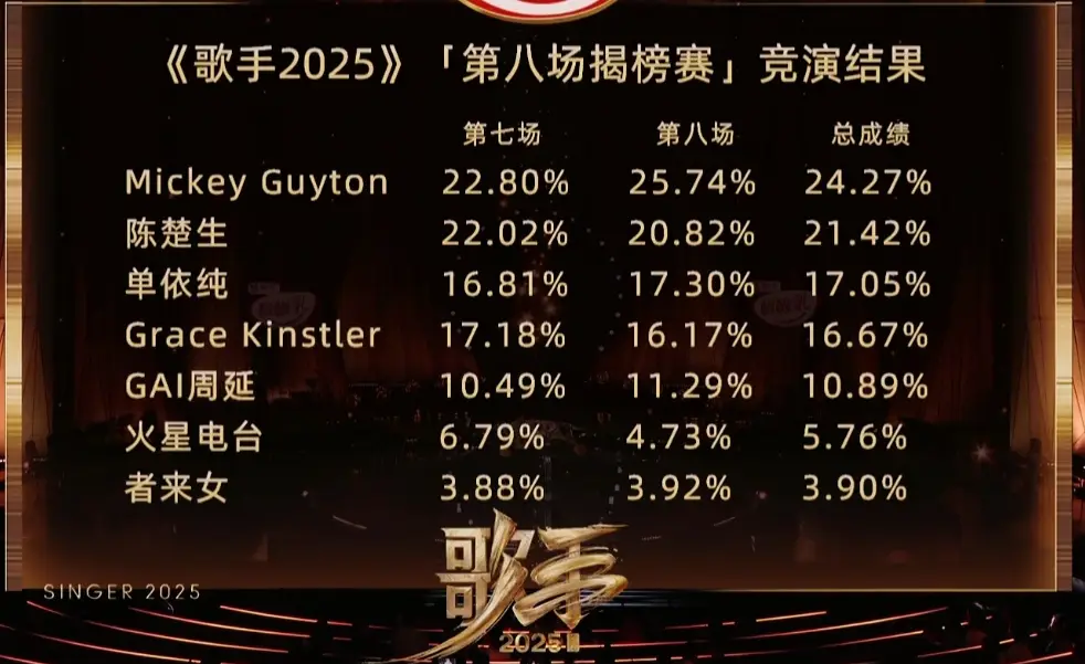 4日,《歌手2025》第八期竞演结果出炉,排名依次是Mickey Guyton、陈楚生、单依纯、Grace Kinstler、GAI周延、火星电台、者来女。其中,Mickey Guyton蝉联第一;李佳薇和艾莉西亚·伊芙琳(Alexia Evellyn)揭榜成功;者来女和火星电台被淘汰了。