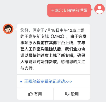 对此,网易云音乐客服表示:“原定于7月18日中午12点上线的王嘉尔新专辑《MM2》,由于突发事项原因提前在其他平台上线,在与艺人工作室沟通确认后,我们全力协调以最快的速度上线了新专辑,确保大家能及时听到新歌。”