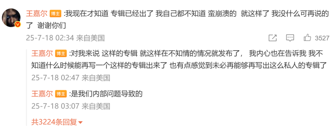 随后,王嘉尔留言回应称:“我现在才知道,专辑已经出了,我自己都不知道,蛮崩溃的,就这样了,我没什么可再说的了,谢谢你们。”