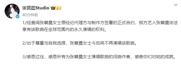 7月25日,张碧晨工作室就《年轮》歌曲引发的舆论争议作出回应,表示经查阅正式合约,张碧晨依法享有该歌曲在全球范围内的永久演唱的权利,但出于尊重与自我选择,张碧晨今后将不再演唱该歌曲。