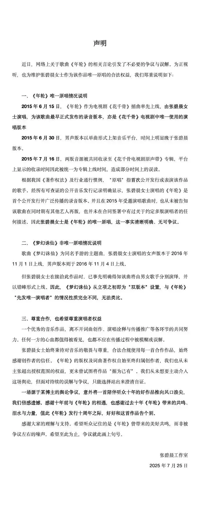 此前,某网红坚持《年轮》原唱是张碧晨,引发热议。25日,张碧晨工作室发声明回应,称张碧晨是《年轮》的唯一原唱,并晒出相关证明资料;而《梦幻诛仙》,歌曲从立项之初即为双版本设置。