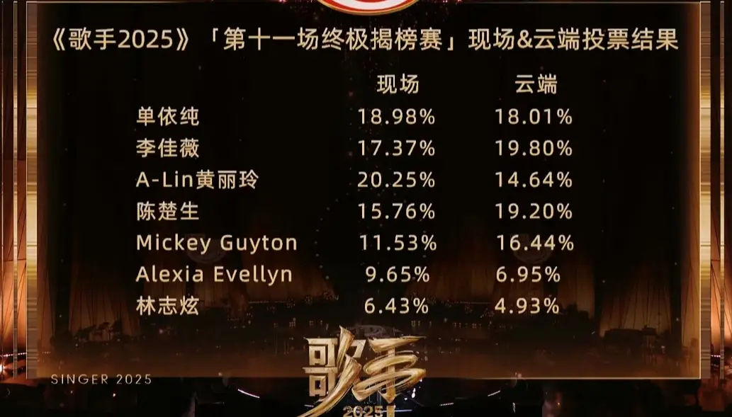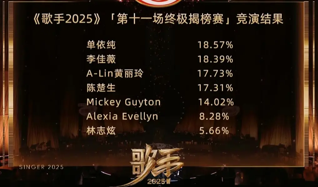 《歌手2025》第11期竞演结果出炉,排名依次是单依纯、李佳薇、A-Lin黄丽玲、陈楚生、Mickey Guyton(米奇·盖顿)、Alexia Evellyn(艾莉西亚·伊芙琳)、林志炫。此外,胡海泉、云飞揭榜失败,Grace Kinstler(格瑞丝·金斯勒)冲榜失败,首发歌手单依纯、陈楚生、Mickey Guyton直通总决赛!