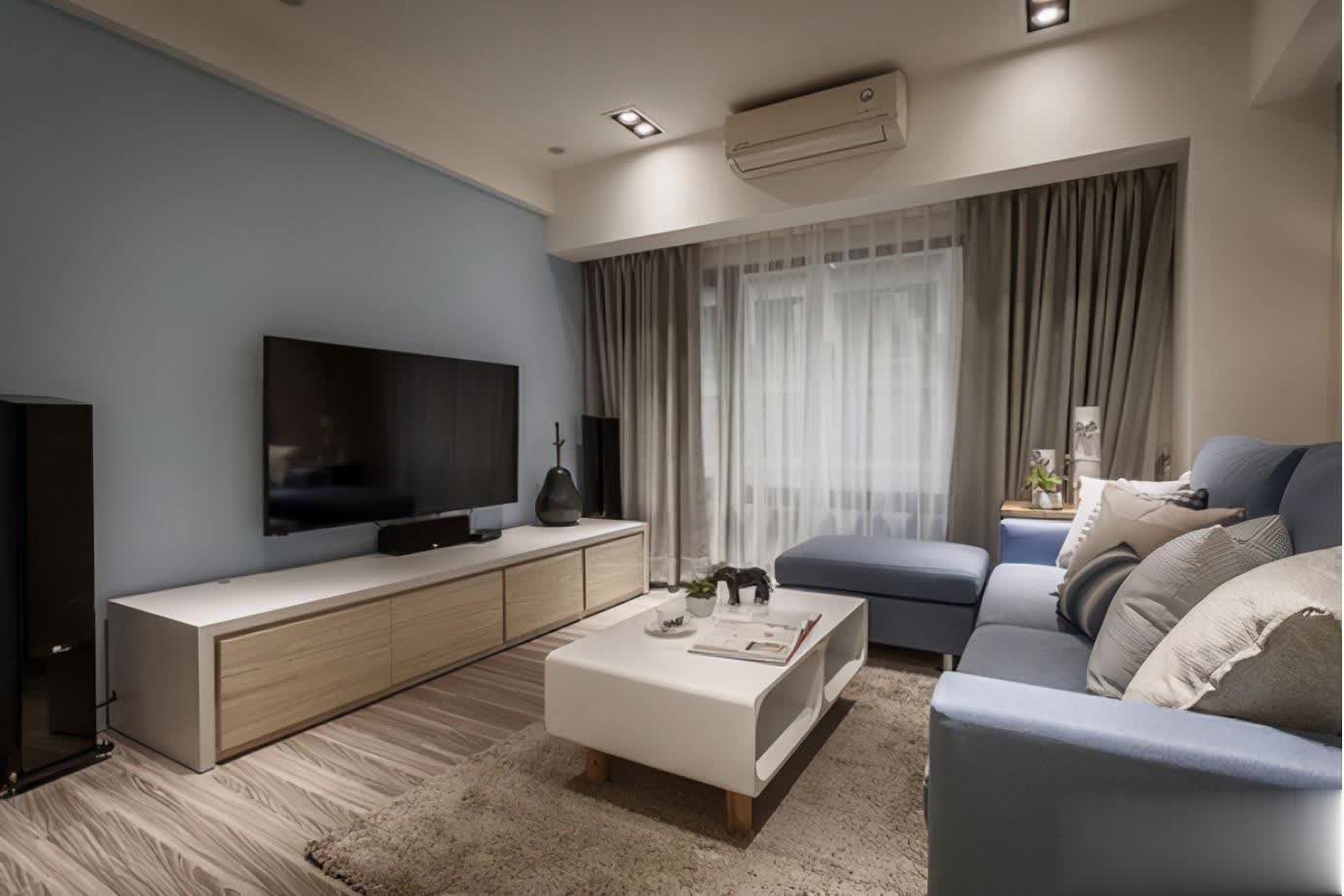 客厅多是采用了木色和蓝色作为搭配,像是木色的地板和电视柜,蓝色的电视背景墙和沙发,这种自然色系将窗外和室内的景观进行结合。