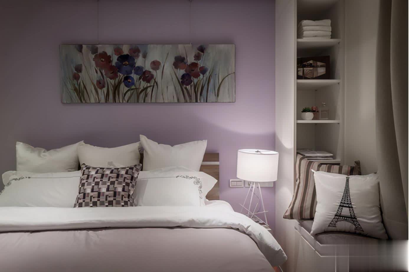 主卧的色调是紫色,而紫色也会给人一种安定和放松的感觉。床边的卧榻提供了休闲的区域,而和卧榻一体的小柜子也充分利用了空间,实现收纳功能。床头上方的条形挂画和床头背墙的紫色相性和谐,也提升了空间品味。