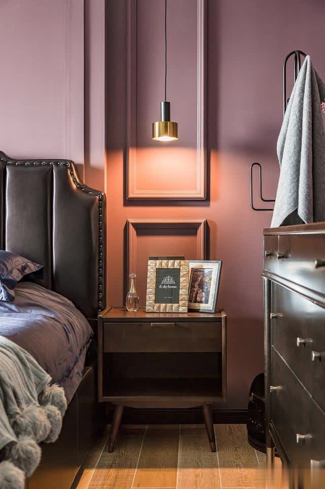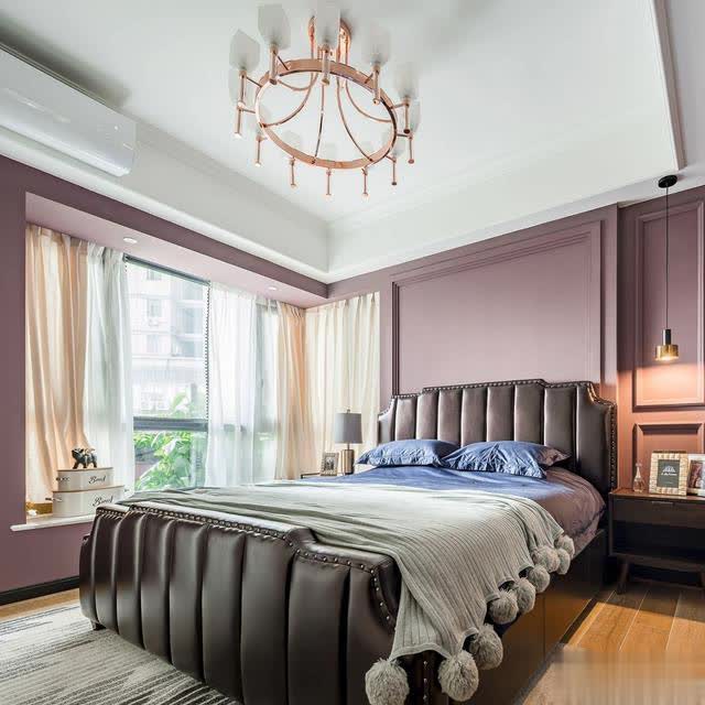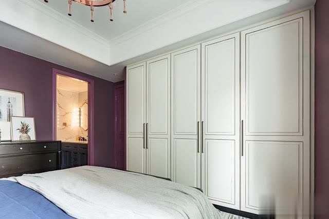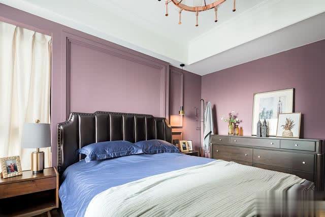 主卧的色彩表现还是比较丰富的,墙面的葡萄紫渲染整体空间的表现效果,纯黑的皮质大床看起来很有一种复古奢华的质感。床头的位置,用多层的线条进行修饰,让空间更有纵深感,从视觉效果上也得到了拉长。