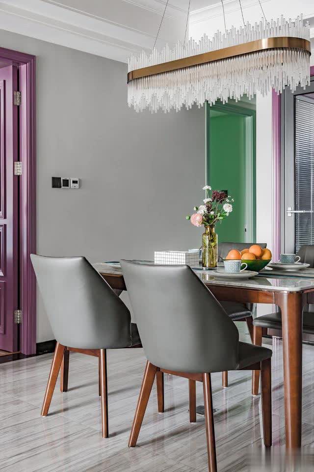 餐桌椅是比较传统经典的木作、大理石加上皮质面的组合,在轻奢、现代风格当中使用得比较多。上面的大型水晶吊灯有金色元素作为修饰,让餐厅更多一些华丽的装饰效果。