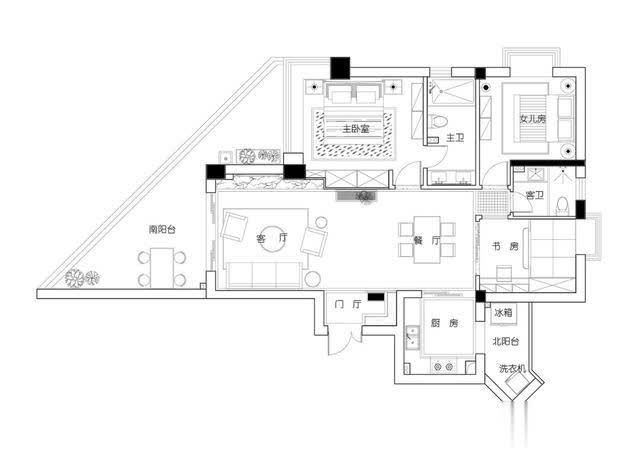 142平混搭风三居室,异型大阳台打造舒适休闲美家
