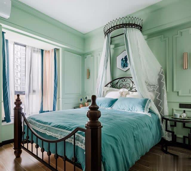儿童房的主题就是清新,抹茶色的墙面阐述了绿林的主题,精致的大床加上垂下的帐幔,打造属于孩子的林中精灵屋。