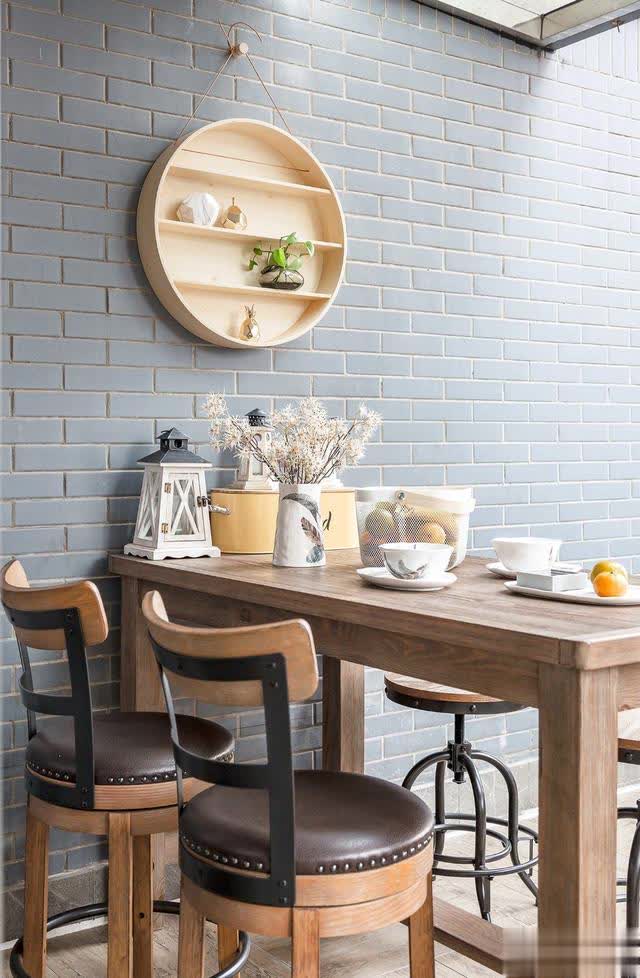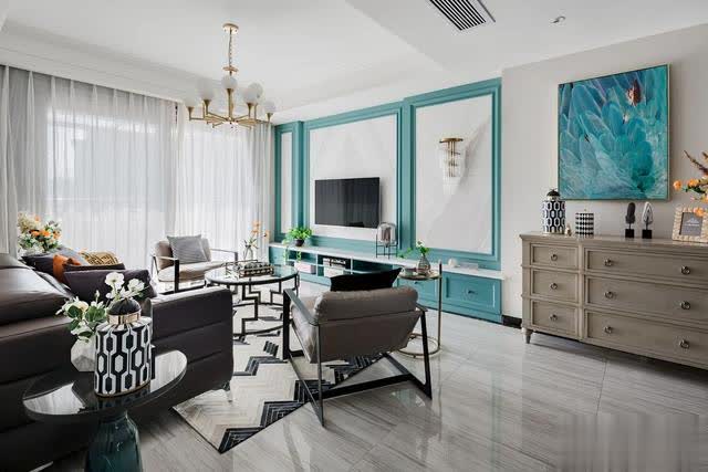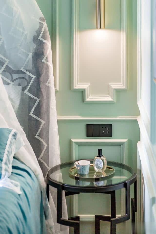 电视墙面是护墙板和大理石的组合,蓝绿色的护墙板作为框架,和纯白搭配显得更加有气质和格调。而墙面还有一层大理石面的层板,可以放置一些小物品。实际上纯白大理石元素在电视墙还有沙发墙上都有体现,也让两个墙面有了更加紧密的联系。